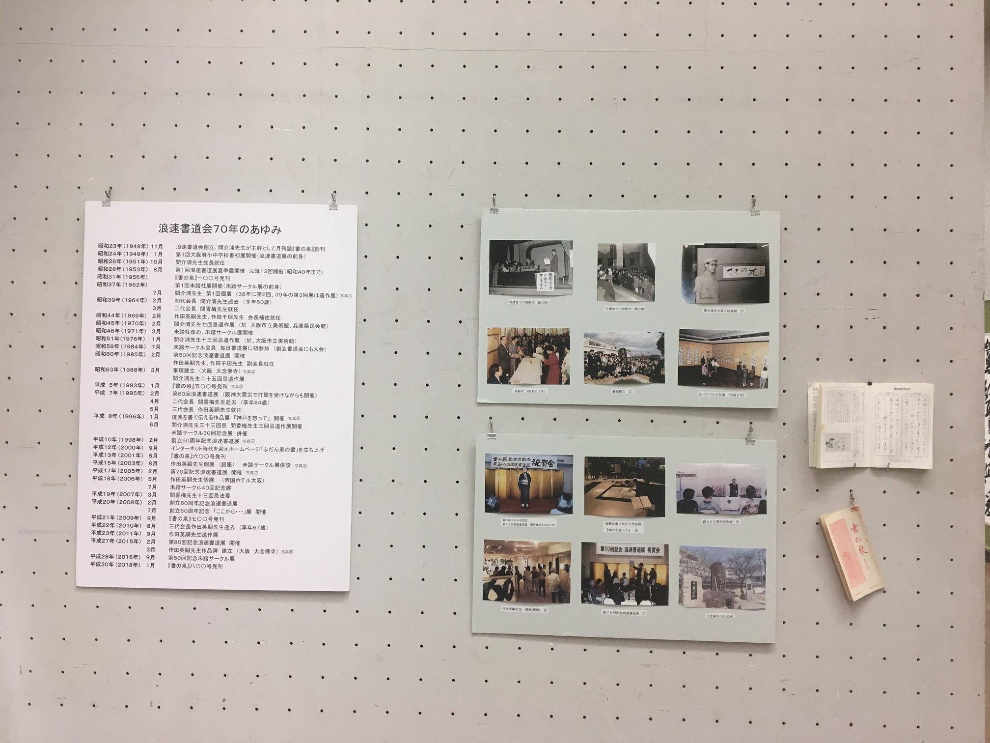 浪速書道会70年の歩みを掲示、書道月刊誌『書の泉』の初期の冊子を展示すると歴史の流れや深みを感じました。