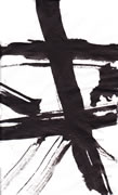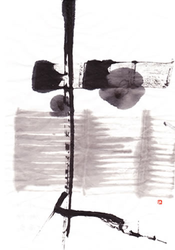 評:とても独創的な作品です。筆を使わずに他のもので書いているので線が違い、また個性的な作品になっています。墨色も途中が変わり、思いつかないアイデアですね。筆とは違うかすれが出て、面白いです。一つの字の中に墨色が3種類もあり、絵画のようにも見えます。