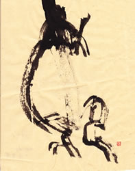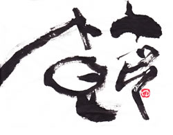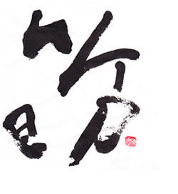評:竹かんむりの動きがとてもあり、余白がうまく活きています。毎回のポイントですが、やはり墨量の変化は、大事ですね。墨が入っているから細い線が引き立ちます。落款の位置も字の中にあり、大胆な場所にありますね。少し遊び心のある位置には落款印も、堅い字や四角でなく、変形印など使うのも効果的です。
