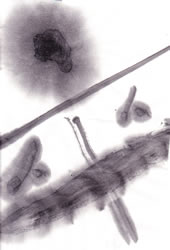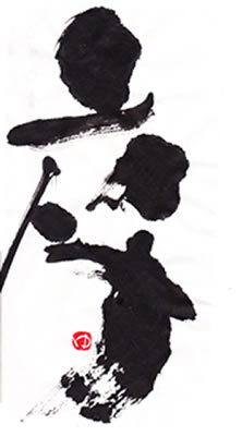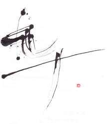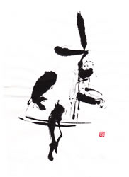 評:この作品は、細い線と淡墨のにじみで、上品な作品ですね。こちらも「これが1番」の作品と同じく左右対称でないよううまく表現されています。左側の余白など効果的ですね。白と黒のバランスが良いです。作品を作るときは、書くところだけでなく書かない部分(余白)も考えて創作してみましょう。