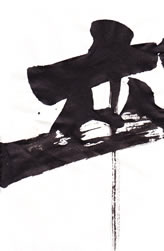 評:思いっきりのよい作品です。筆の割れた線をうまく生かして明るく表現していますね。「卒」は左右対称の字なので、特に中の人の部分や横画のバランスなどを変化すると良いです。この作品は、そのところが自然とうまくできています。襟元を正して卒業式にでる小学生のようですね。