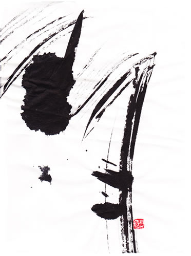 評:こちらは、大きな羽を広げて羽ばたいている鳥のようにみえますね。鷲(わし)とか大きな鳥でしょうか。それから、カスレが風を感じて動きがあります。カスレの生かし方は、墨の入っている部分もちゃんと作ることが大切です。中の部分の墨量が利いています。