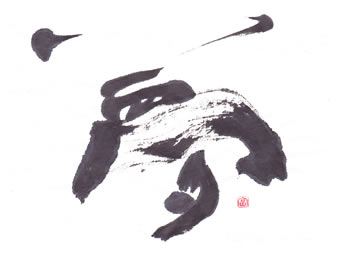 評:夢の文字ですが、とても不思議な模様になっています。これは、洋紙に書いているので、このようなムラのある墨色になっています。カレンダーの裏を使っています。墨を吸わないので、たまったところが濃くなります。書かれた方は、いつも独創的な表現で書いていて楽しませてもらっています。今回は、夢の世界のような雰囲気にとても合うと思い、選びました。皆さんも、身近な紙に書いてみるのもいいですね。