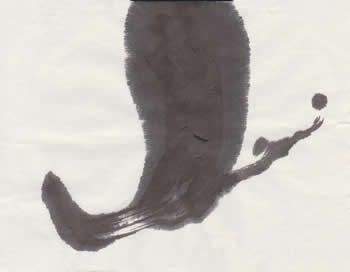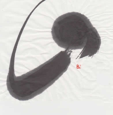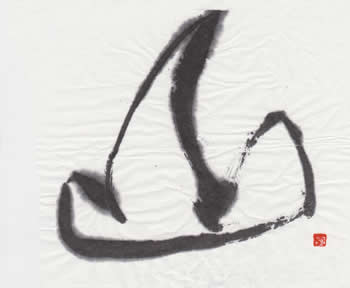 評:第一印象は、山水画の山の絵のようだと思いました。墨だけで描くことでは、書と通じるものがありますね。山が連なっている形から字ができましたが、山もそれぞれ形が違うようにう、線やにじみカスレで、いろいろな表情をしている風景を表していると思います。