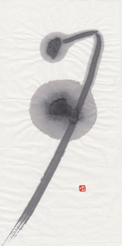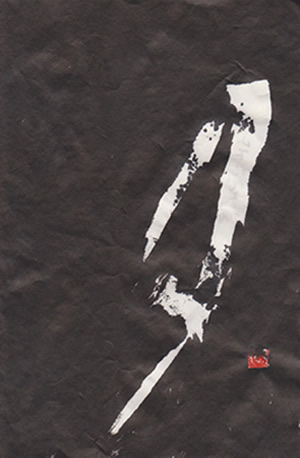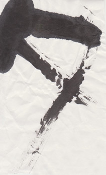 評:夕暮れのようなやわらかい作品です。淡墨と少ししわを寄せたのが、雲の間から月が見えるような繊細な作品ですね。画数が少ない漢字は、表現が難しいので、思い切った線や、色合いなどいろいろと工夫すると、良い作品になります。