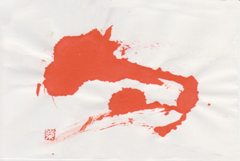 評:この作品は、朱墨で書かれていて、墨の黒とはまた違った感じに仕上がって面白い作品だと思います。「夕」だから、きれいな夕焼け空を連想させますね。線も動きが大きく楽な線で書いているのが、良いと思います。字の中の空間も生きていますね。