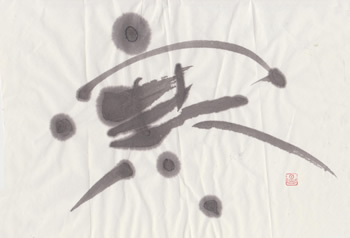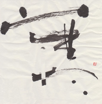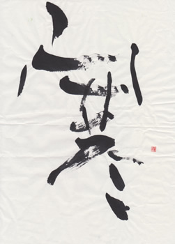 評:「寒」の漢字は、下の二画が氷を表しています。その意味を考えながら作品を見ると、冷たい空気が見えるような作品ですね。淡墨と細い線、にじみを活かして構成されています。白の部分(余白)が多いとさみしい印象にもなるので、とても合っていると思います。