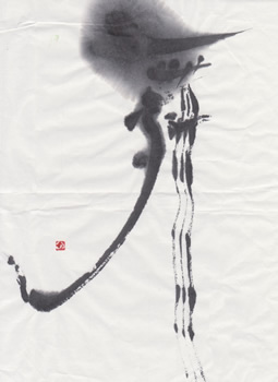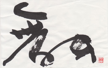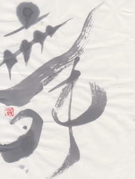 評:色の墨を使い、軽やかな線の作品ですね。線もやわらかく動きの大きいところが、踊っている人のようです。字の左右のバランス(重心)を変えるとそれがよく表現されます。小作品などでは、字の意味に合わせて、色を使って書くのも創作意欲がわいてくると思います。