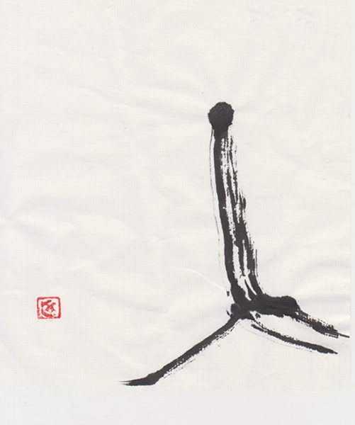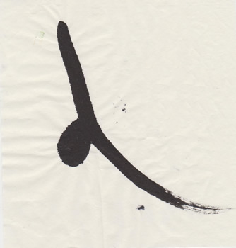 評:「入」の漢字は、二画しかないので、表現が難しかったと思います。こちらは、直線的な線で構成されていて、人が歩いているように見えました。線の割れたかすれなどを活かしていて面白いです。紙の下部に書かれているので、上の余白が広くあるので地を歩いているように見えたのでしょう。