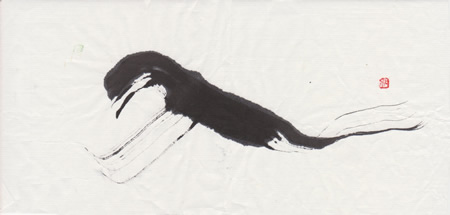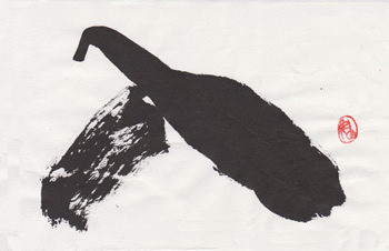 評:今回も面白い作品で、目を引きました。二画目の大胆な太い線が、大きな波のようです。夏の海で、サーフィンをしているような感じで、落款印が人でしょうか?そんな想像をさせてくれるような作品です。このように太細を思いっきりしてみるのもいいですね。