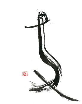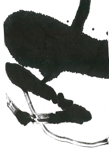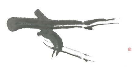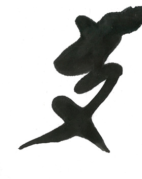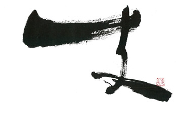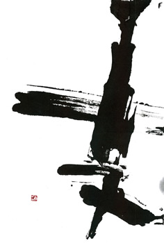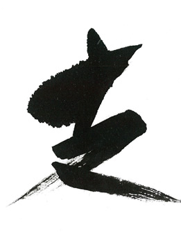 評:いつものように、大胆な作品が目立つ中、余白の白と線の柔らかさが際立った作品です。シンプルに余計なものをそぎ落とした凛とした空気が伝わるようです。書の魅力は、墨の悪深さもありますが、こうして空間の美しさも必要ですね。単に、漢字を面白くデフォルメするのではなく成り立ちから伺える形の美しさを参考に作品を書くといいですね。