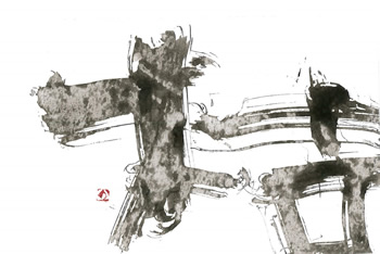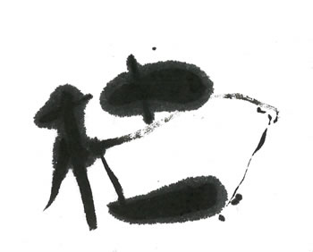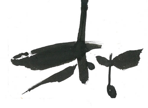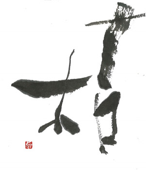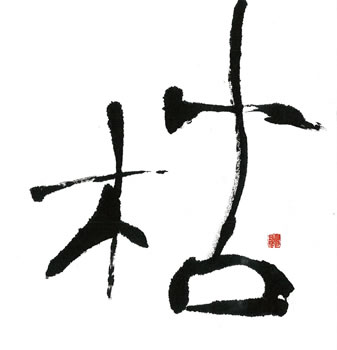 評:こちらの作品は、細い線で全体にカスレをいかしたのがとても「枯」のイメージにあっていると思いました。枯れ枝のようにに見え、柿の木かな?とか想像したくなります。細い線と字形の傾きや空間の使い方がうまいですね。墨を多く使っている作品もよいですが、こうやって漢字の意味に合うように、線も考えて作品を作るとよいと思います。