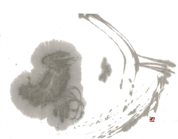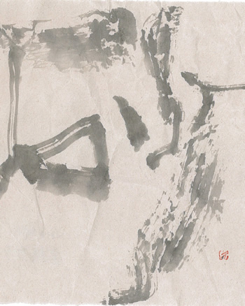 評:こちらも淡墨で、さわやかさがあります。最終画の長いのは、同じですが筆を開いた線で豊かに見えます。思い切り伸ばしたおかげで、左側の余白が明るさを出してくれています。印の位置を左に変えてみると、また違った印象になりますよ。