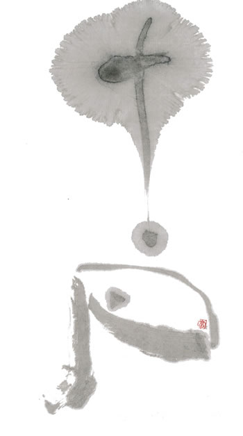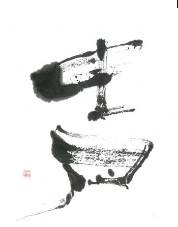 評:二画目が長く高さのある作品ですね。高い建物のように見えてきました。周りの余白が出来て立体感があります。中の縦画を少し淡墨でにじみを効かせて変化を出しています。墨の色が変わり面白い作品になりましたね。