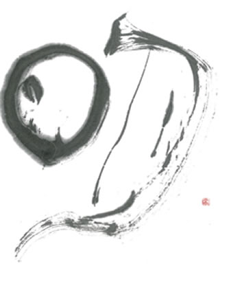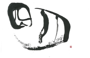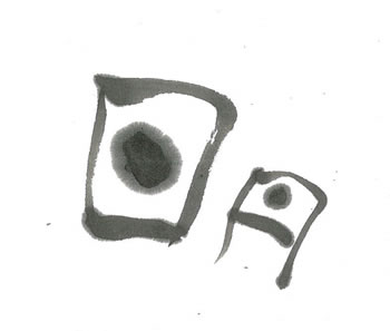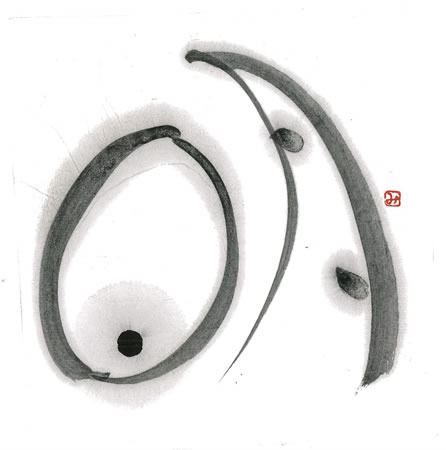 評:とても絵画的で素敵な作品です。月の部分の細線と日の部分の筆が開いた線のコントラストが絶妙です。単純な形なので、変化を思いっきりつけているところが長年の創作に出ていると思います。