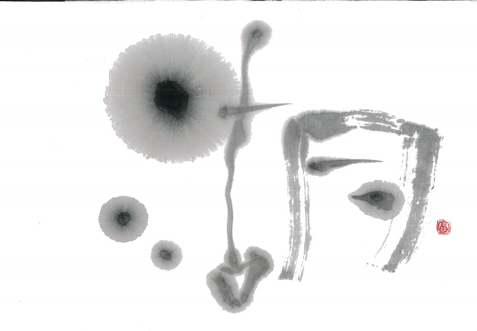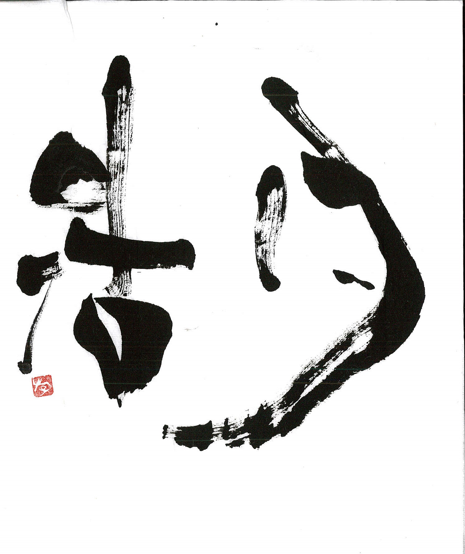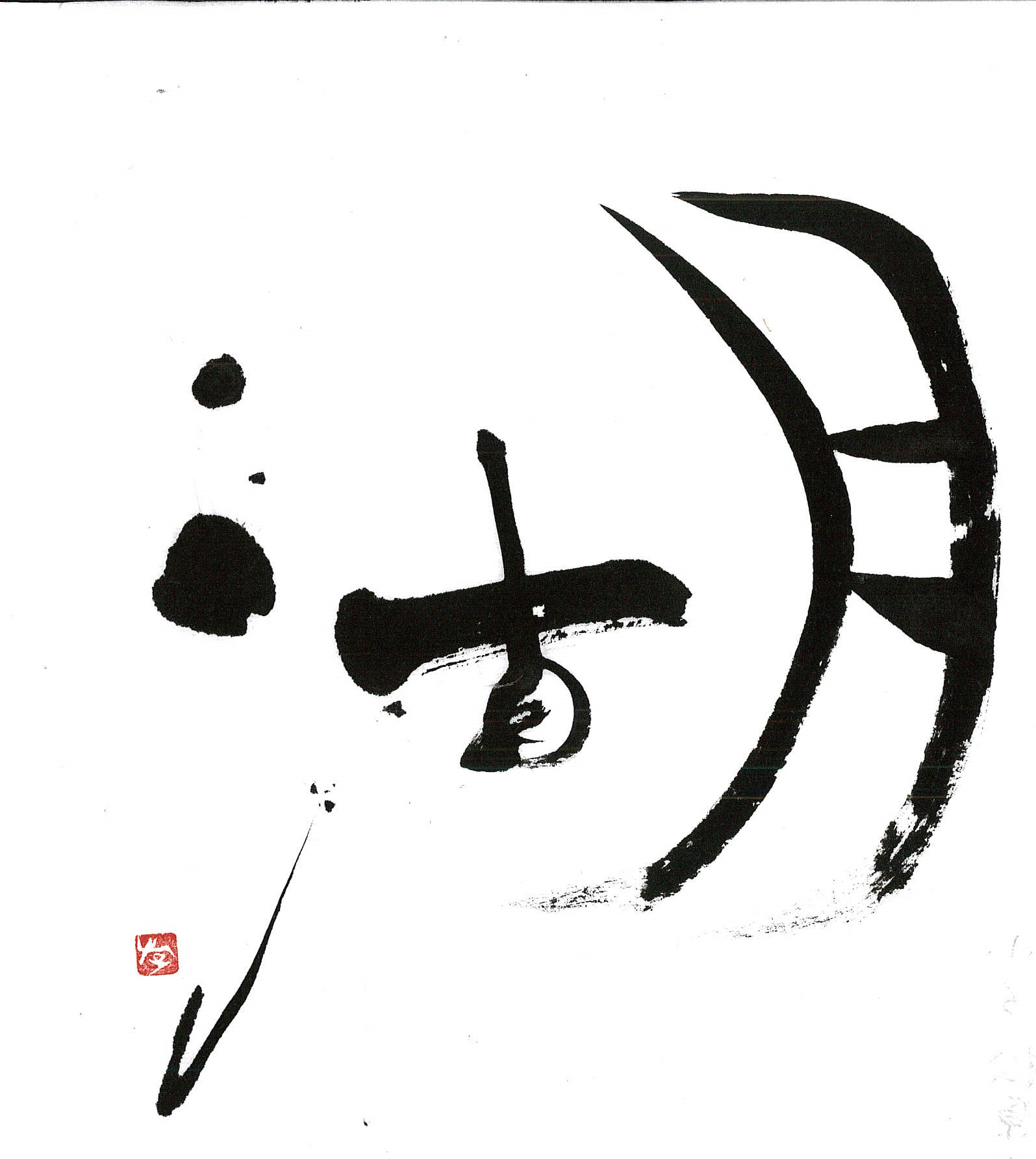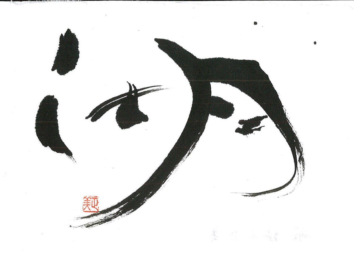 評:こちらは、水墨画の様で情緒ある作品だと思いました。さんずい偏が湖の水面の波のようで、「古・月」が湖のうかぶ舟のような…。にじみにくい紙で墨の濃度でうすいところが出来ていてそれが水墨画の感じを醸し出しているんですね。