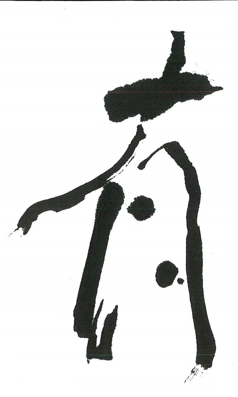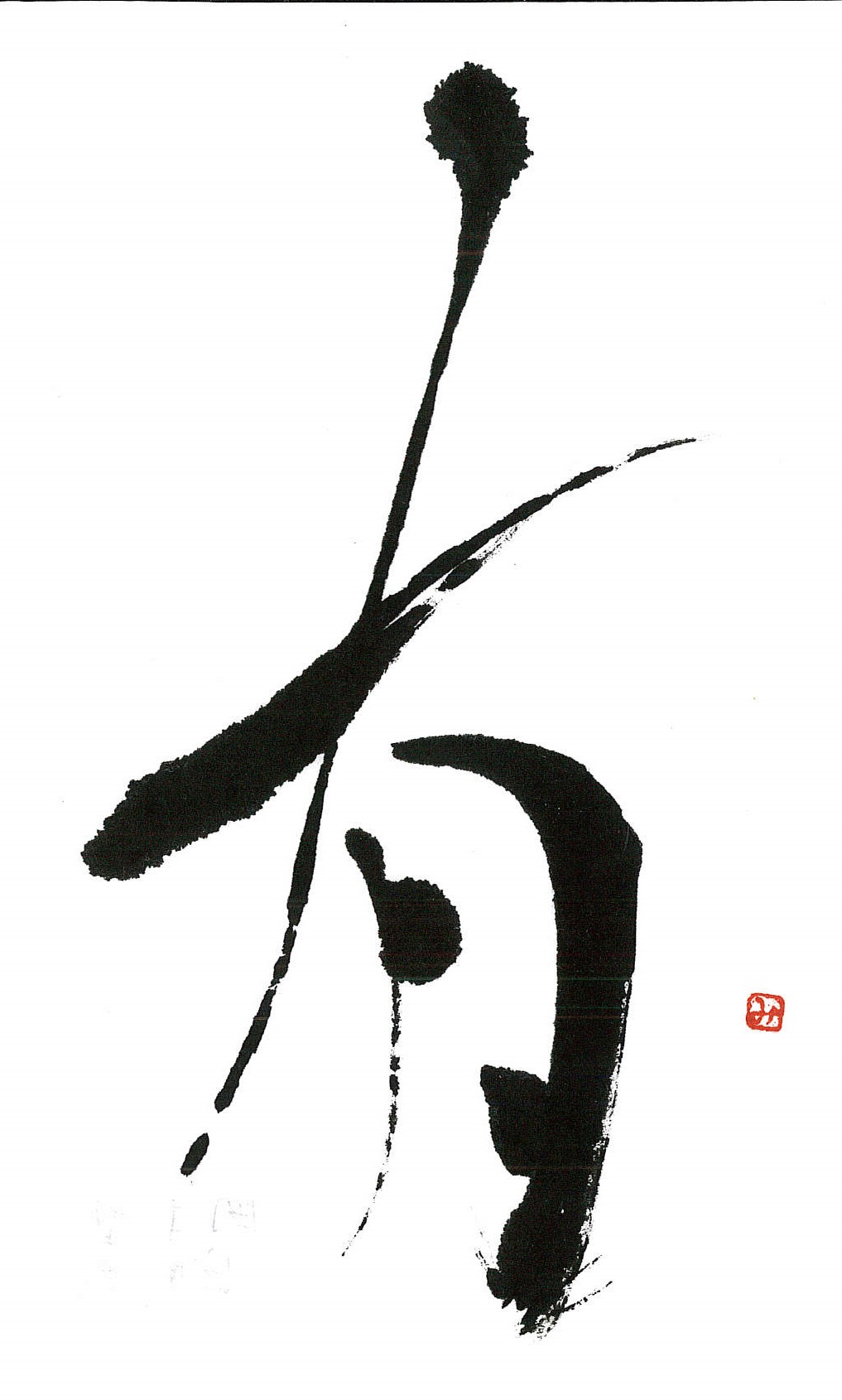 評:こちらも一気に流れて書いているので、線に動きがあります。月の中の二画は点と置いてにじみを生かしていますね。字の中の空間が面白いです。腕を大きく動かして指揮者のように思います。