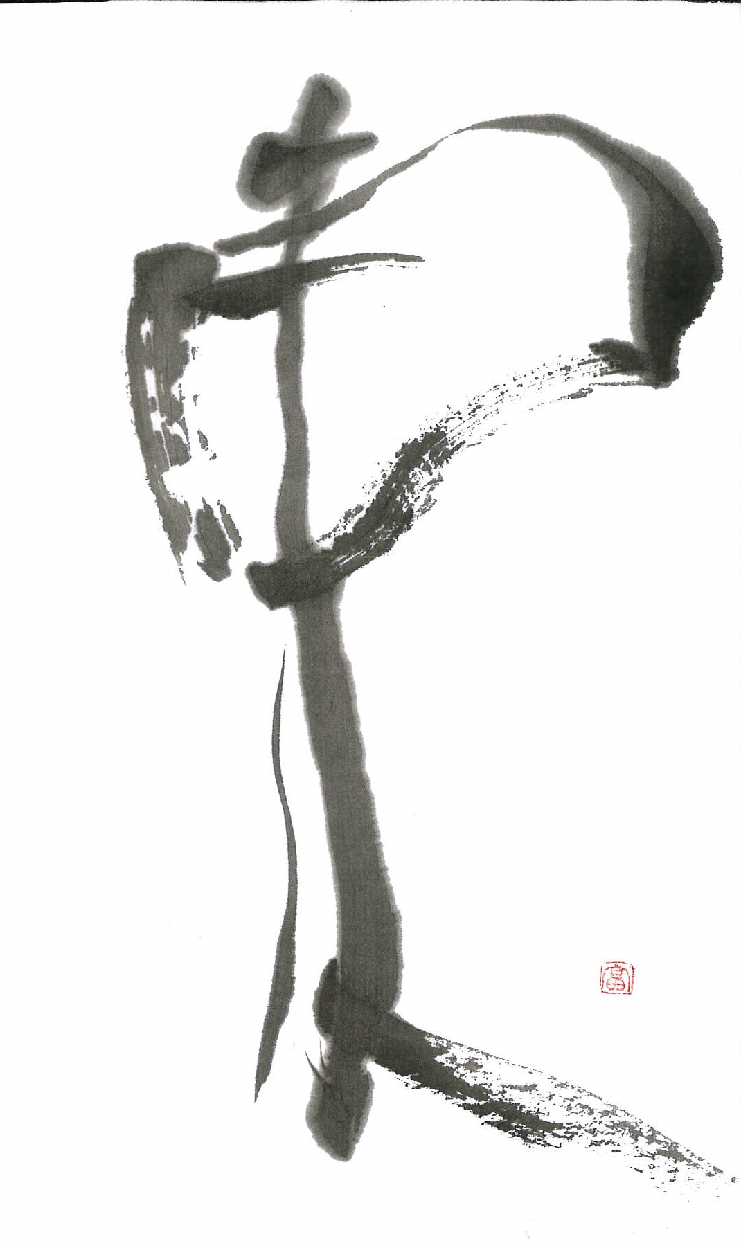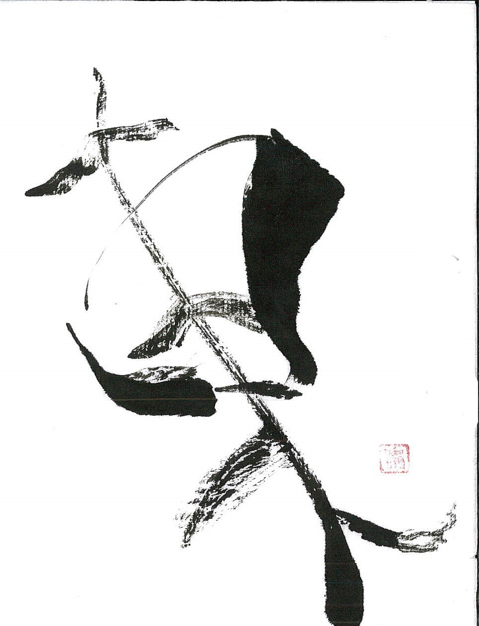 評:左右対称の字なので、均等にならない様に構成しているのか遠近法のバランスでよいと思いました。力まず筆の自然な運びが一体感を出しています。最終画の右払いが紙からはみ出るくらいの勢いで作品が大きく見えますね。