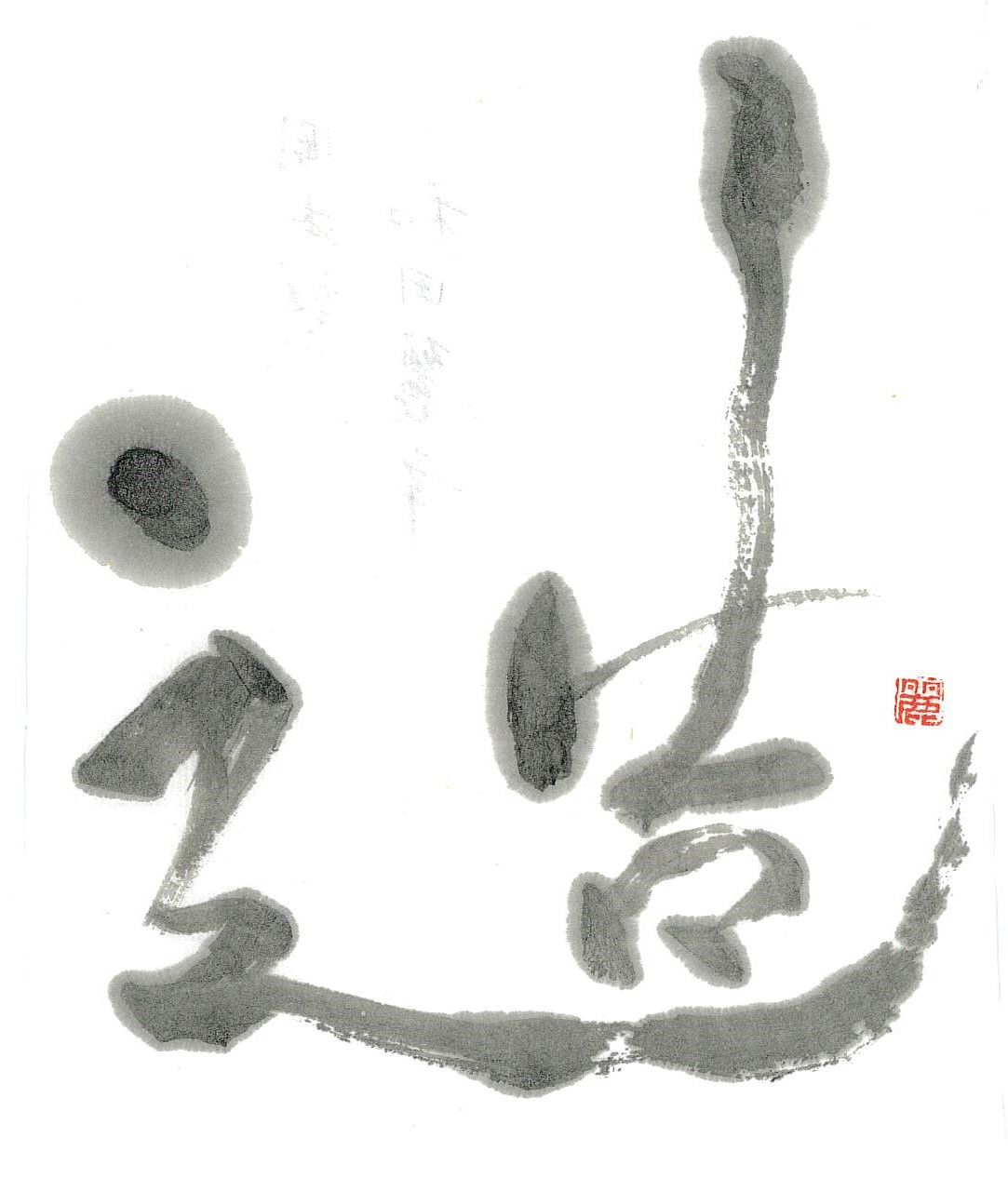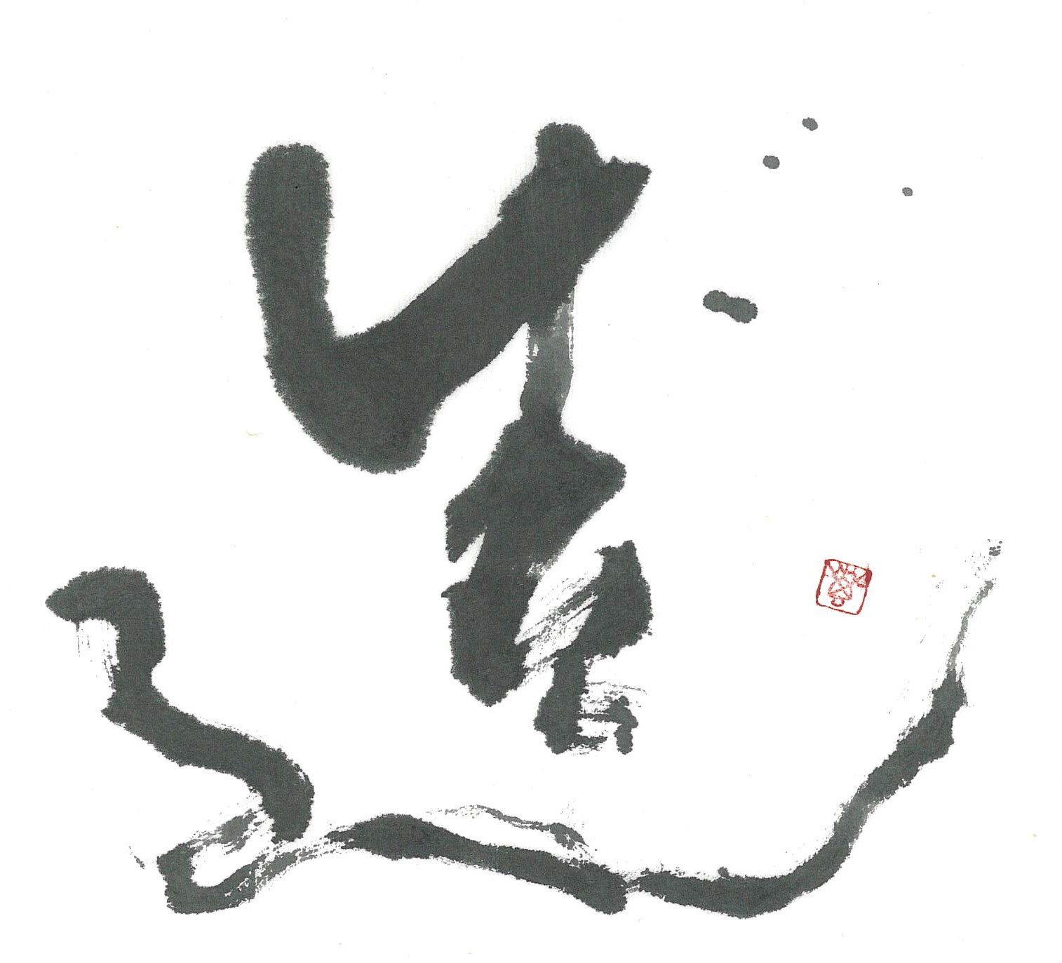 評:とても勢いのある線の作品です。走っているように見えますね。カスレは字の立体感も表せますが、スピード(時間)も感じられます。鋭い線で書くとより速さを表現できますね。新しいものを創造していくイメージにもぴったりです。