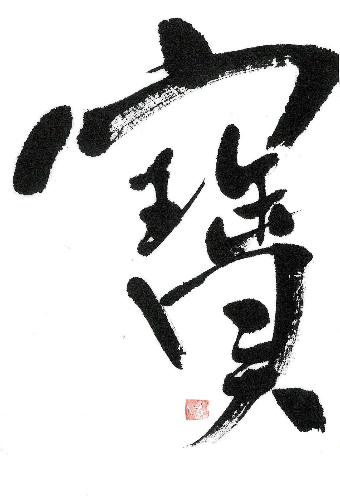 評:宝の中の玉が伸びて面白く、宝物を置く台のように見えました。筆の割れた線を生かして自然に書いているのが良いと思います。左右対称の字ですので、間隔を変えるとまた表情も変わってくると思います。