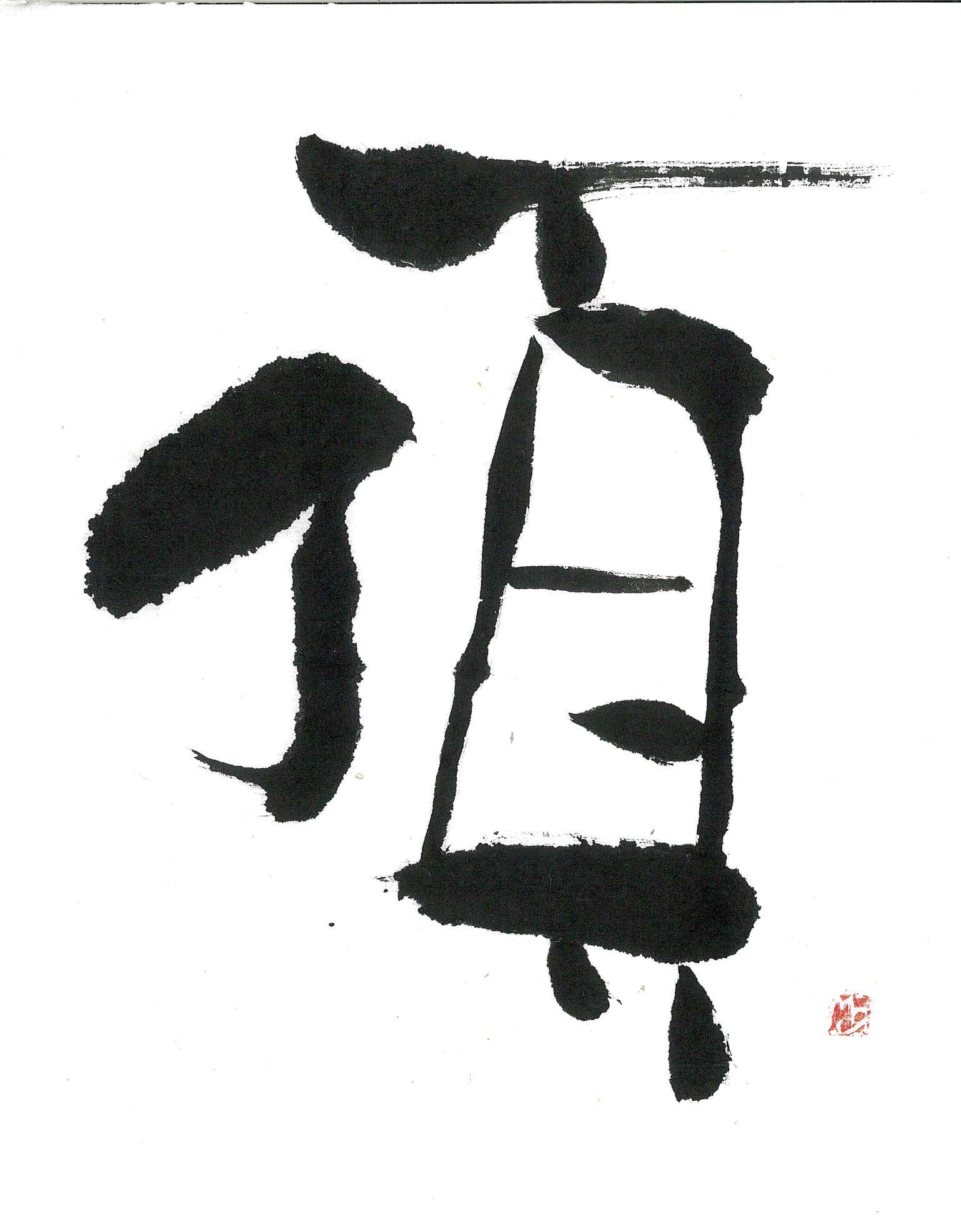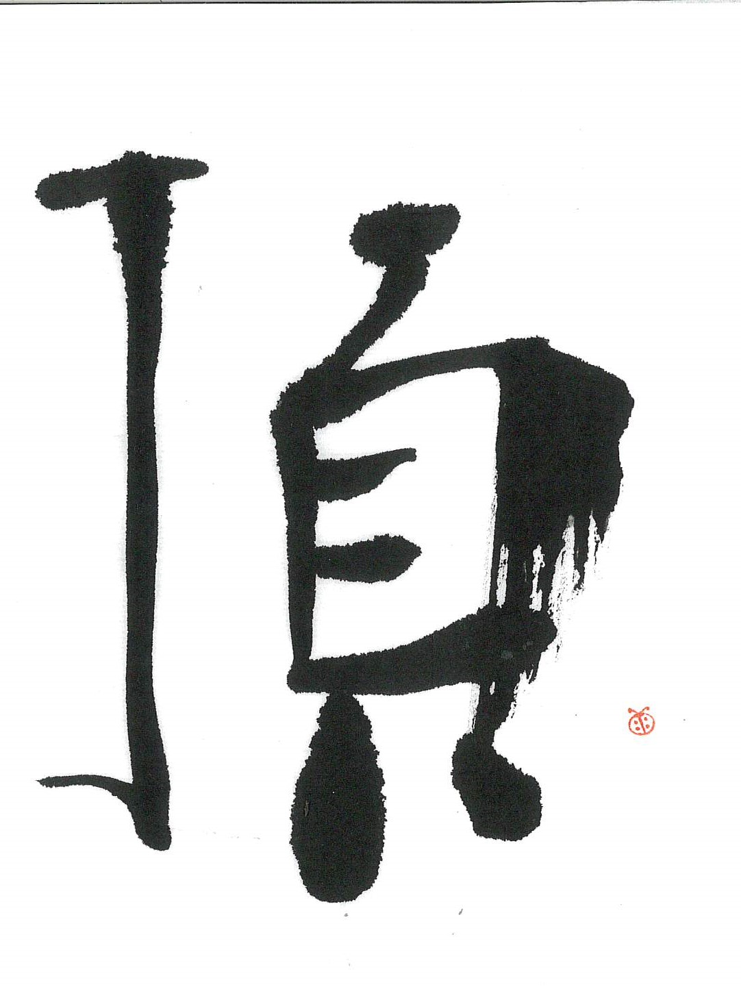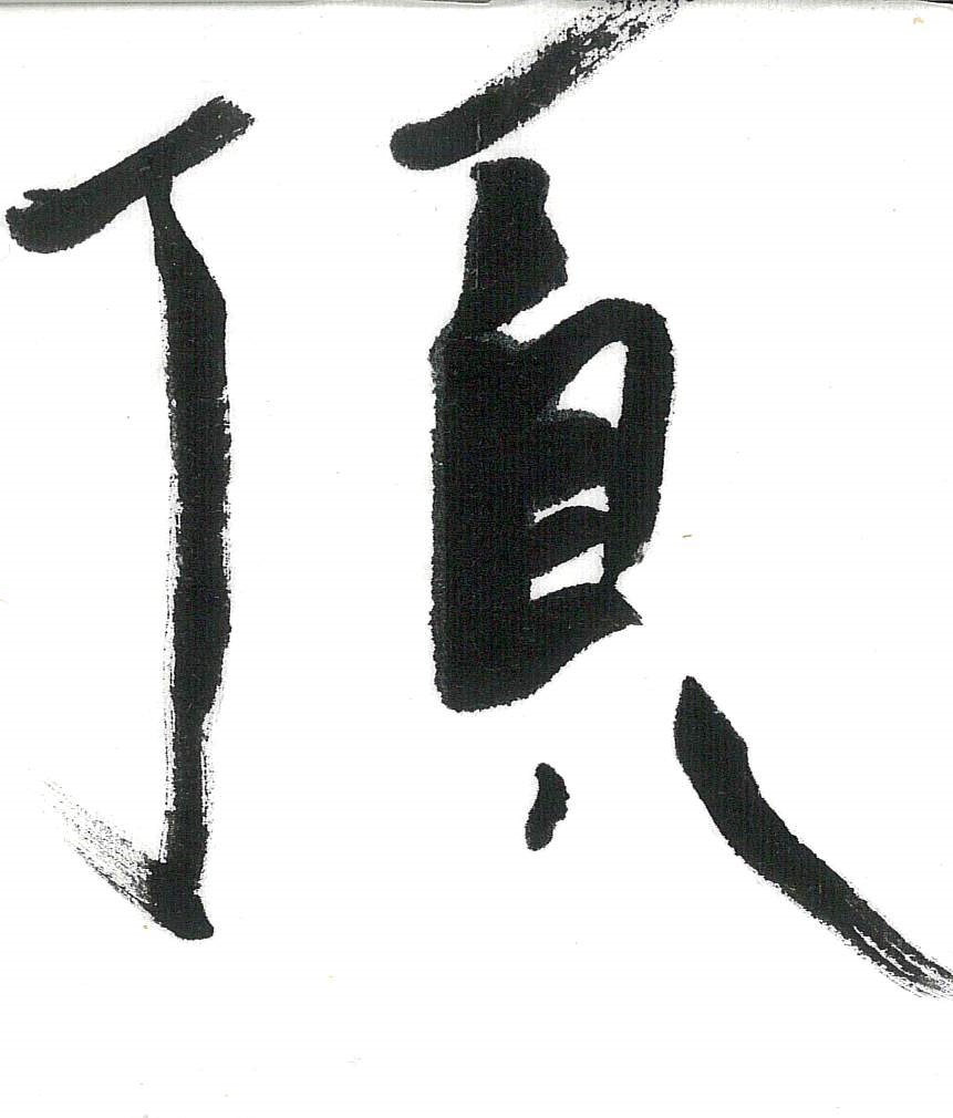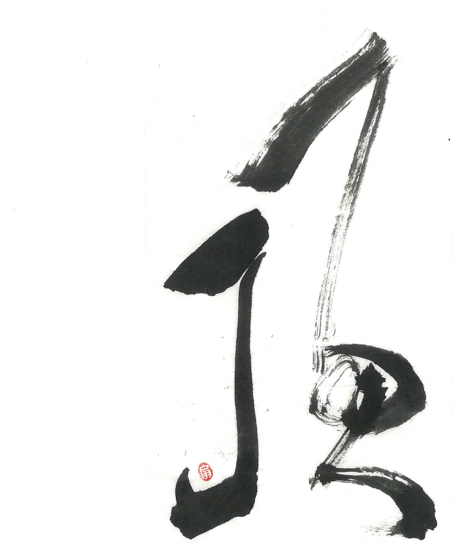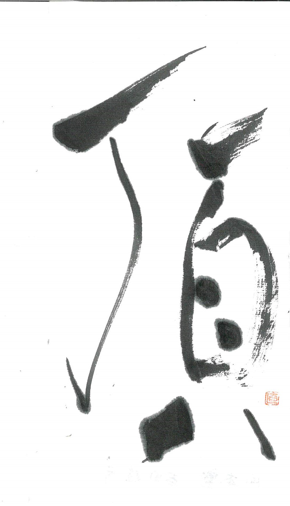 評:とても力強い作品です。古い書体では上に山が付くものがあり、字書で調べて書いたのであろうと思われる様子が浮かびました。山の頂のイメージにぴったりです。漢字の意味と線質などがマッチしていうと見ている人により伝わります。