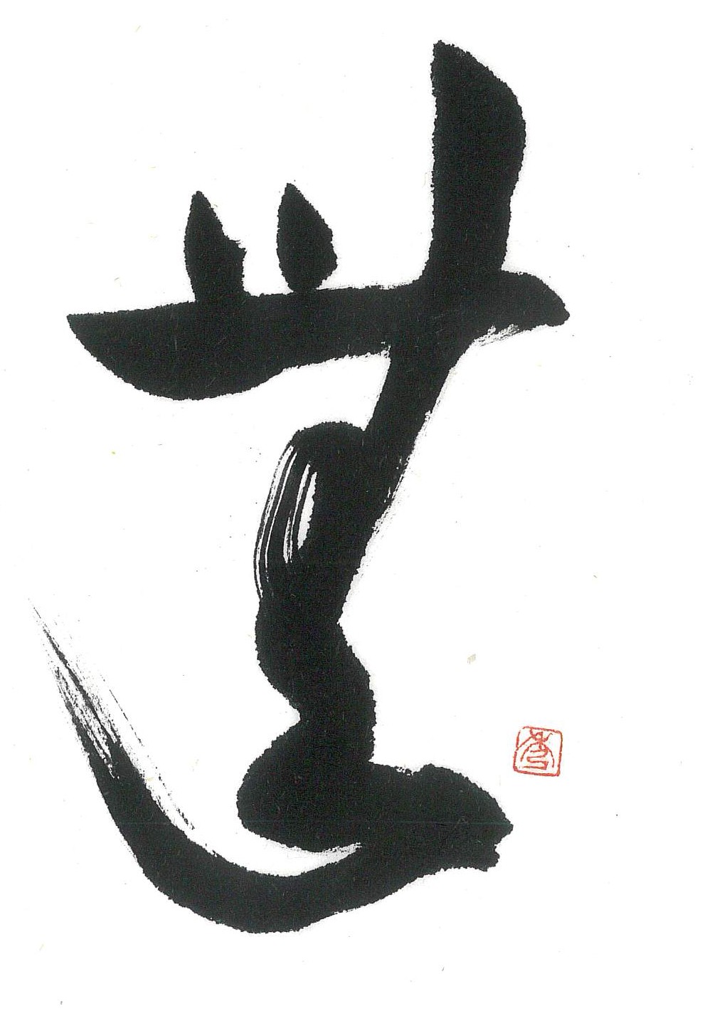 評:こちらは、筆でないもので書かれている線ですね。表情が変わり思わない線がでて面白いです。中の縦画や最後の点などが白く抜けているのがいいですね。無垢(むく)・無邪気(むじゃき)などの言葉が似合います。
