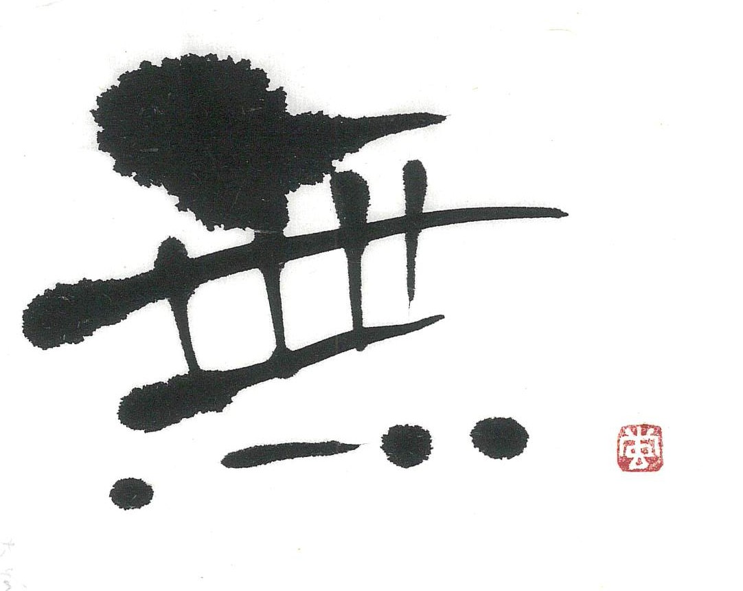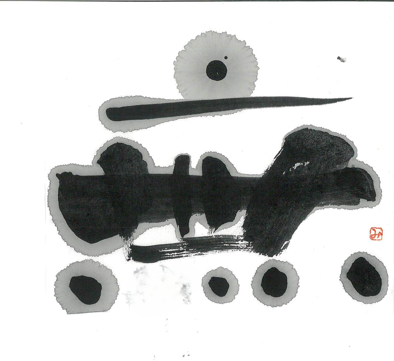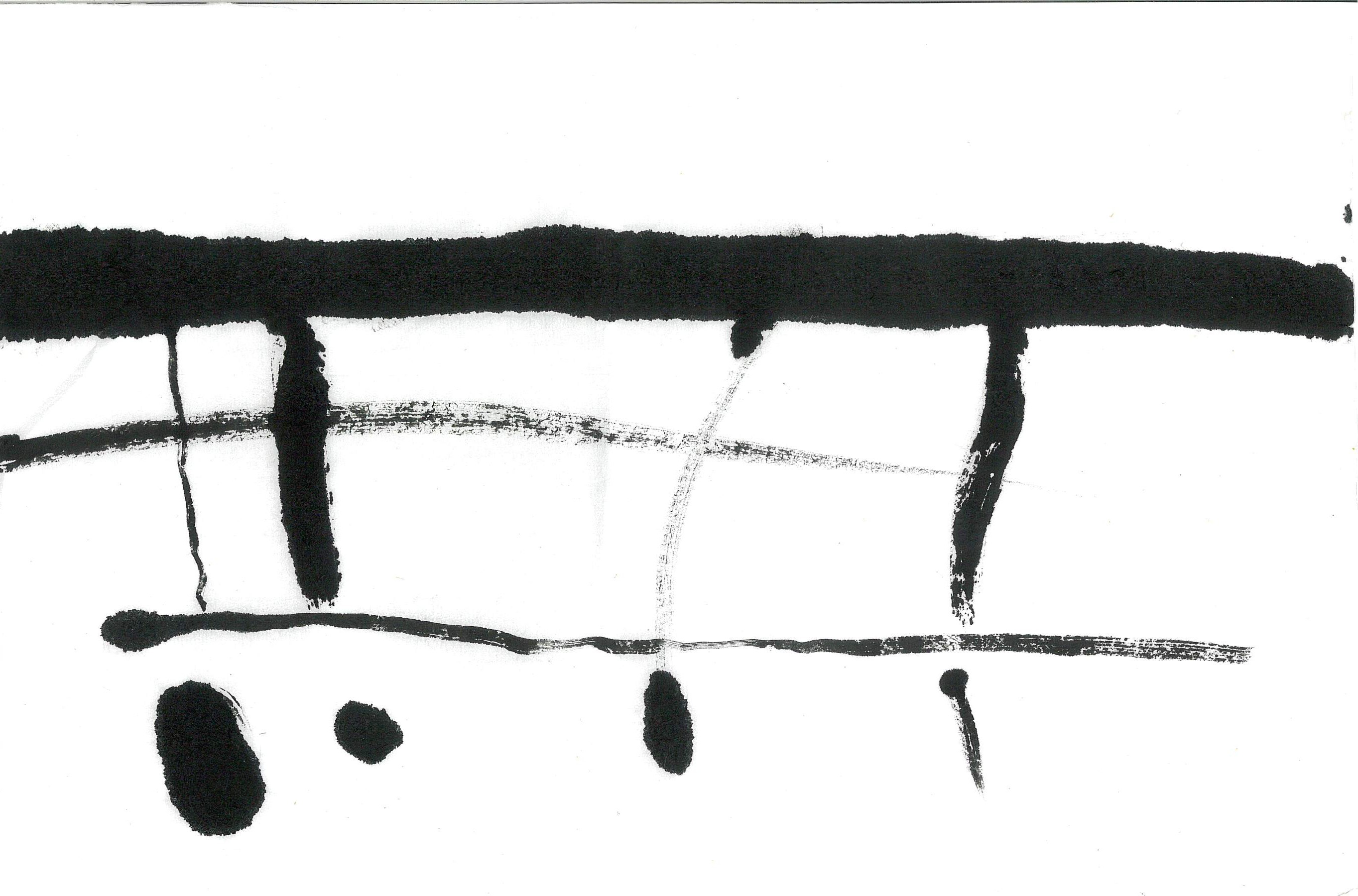 評:宿墨を使って基線の線とにじみがくっきりとでて、面白いですね。点の表情が可愛らしさをイメージさせます。ふわふわした柔らかさが線に表れている感じです。等間隔に書いていないので、動いているようにも見えます。