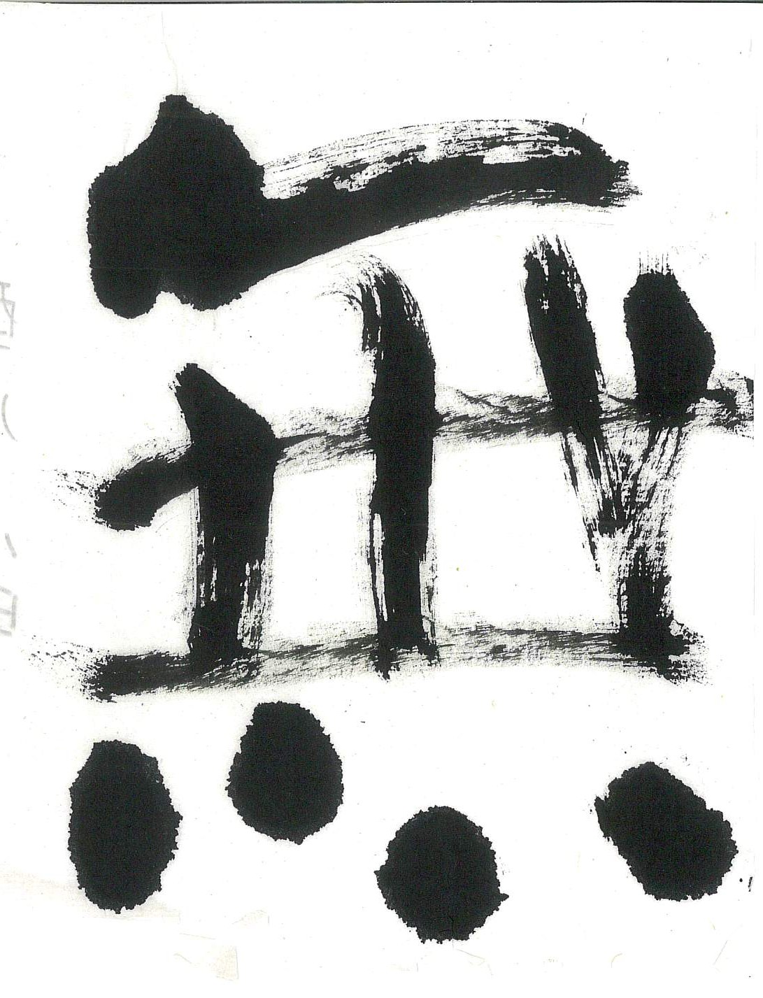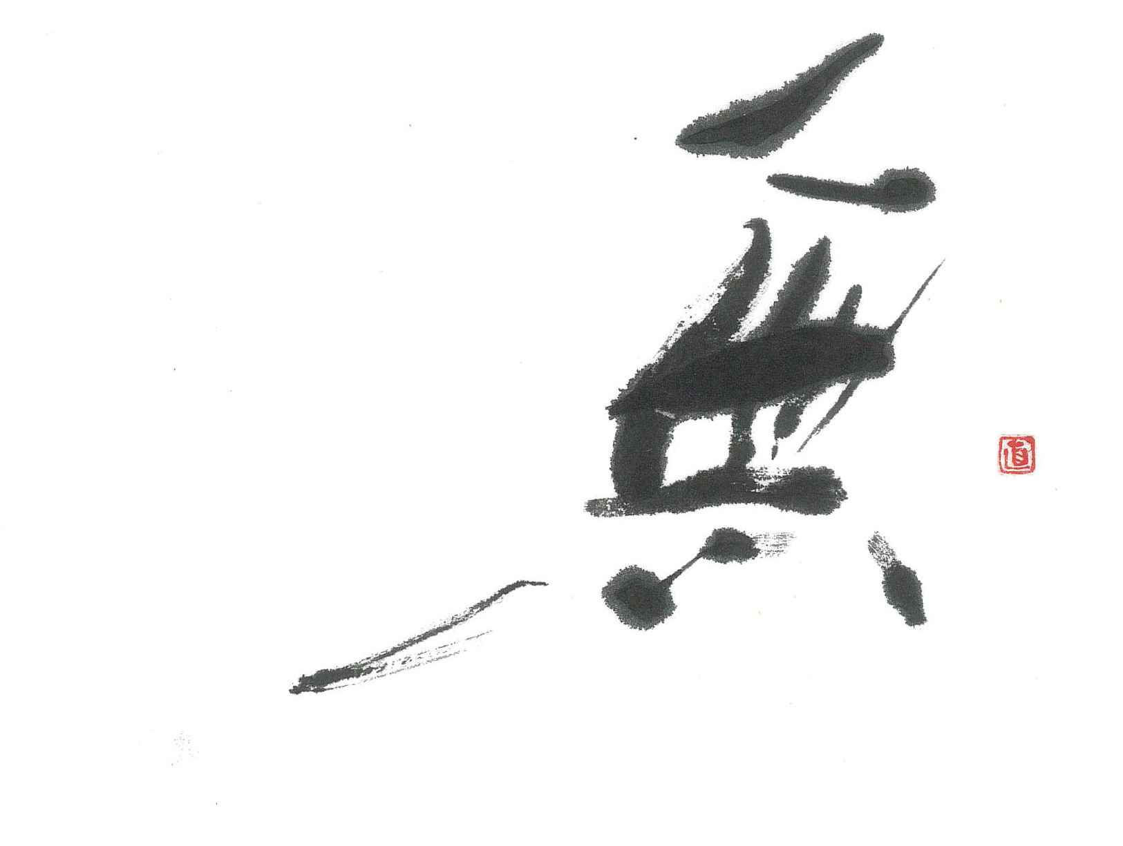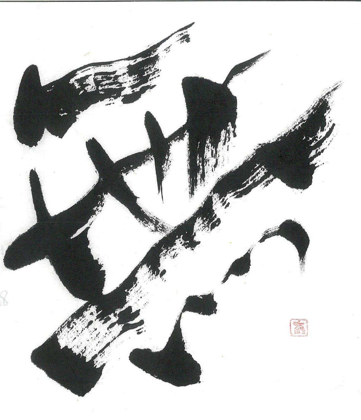 評:宿墨を使って基線の線とにじみがくっきりとでて、面白いですね。点の表情が可愛らしさをイメージさせます。ふわふわした柔らかさが線に表れている感じです。等間隔に書いていないので、動いているようにも見えます。