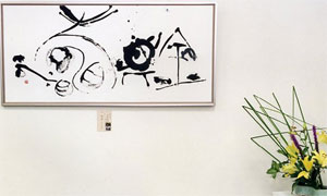 会場を入った正面は、浪速書道会理事による作品のコーナーで始まります。さらに色とりどりの花が会場を鮮やかに彩ります。