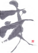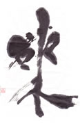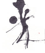 評:とても独創的な作品です。筆を使わずに他のもので書いているので線が違い、また個性的な作品になっています。墨色も途中が変わり、思いつかないアイデアですね。筆とは違うかすれが出て、面白いです。一つの字の中に墨色が3種類もあり、絵画のようにも見えます。