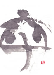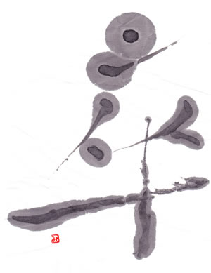 評:この作品は、細い線と淡墨のにじみで、上品な作品ですね。こちらも「これが1番」の作品と同じく左右対称でないよううまく表現されています。左側の余白など効果的ですね。白と黒のバランスが良いです。作品を作るときは、書くところだけでなく書かない部分(余白)も考えて創作してみましょう。