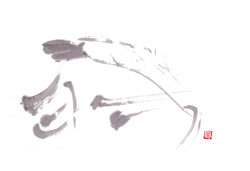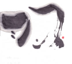 評:こちらは、大きな羽を広げて羽ばたいている鳥のようにみえますね。鷲(わし)とか大きな鳥でしょうか。それから、カスレが風を感じて動きがあります。カスレの生かし方は、墨の入っている部分もちゃんと作ることが大切です。中の部分の墨量が利いています。