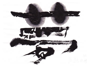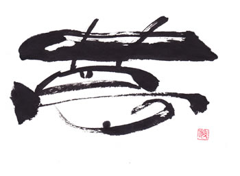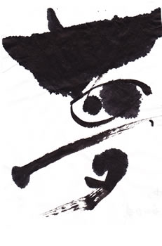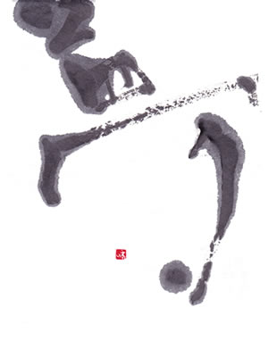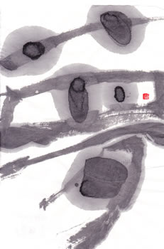 評:夢の文字ですが、とても不思議な模様になっています。これは、洋紙に書いているので、このようなムラのある墨色になっています。カレンダーの裏を使っています。墨を吸わないので、たまったところが濃くなります。書かれた方は、いつも独創的な表現で書いていて楽しませてもらっています。今回は、夢の世界のような雰囲気にとても合うと思い、選びました。皆さんも、身近な紙に書いてみるのもいいですね。