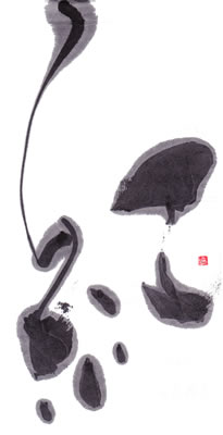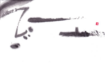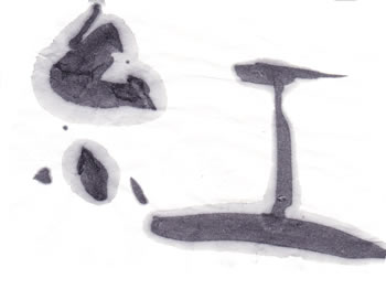 評:こちらも、滲みのある作品ですが、芯がはっきりしているので、少し日がたった墨を使っているのでしょうか?面白い滲みですね。工の部分の思い切りがよいです。線の太い細いが生かされています。墨の色も単に黒いだけでなく、赤みがある黒や青みのある黒など少しずつ違いますので、自分の好きな墨色の黒を見つけると面白いですね。