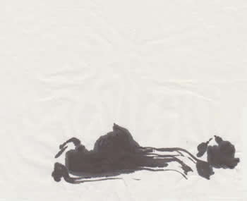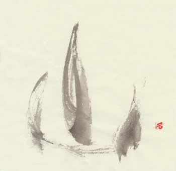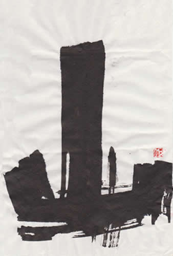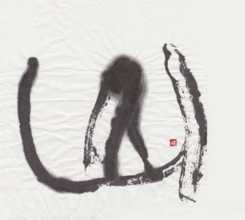 評:第一印象は、山水画の山の絵のようだと思いました。墨だけで描くことでは、書と通じるものがありますね。山が連なっている形から字ができましたが、山もそれぞれ形が違うようにう、線やにじみカスレで、いろいろな表情をしている風景を表していると思います。
