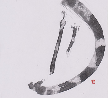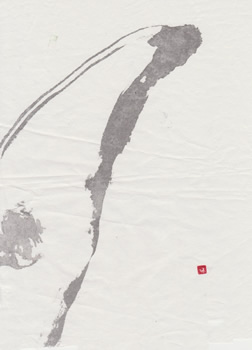 評:夕暮れのようなやわらかい作品です。淡墨と少ししわを寄せたのが、雲の間から月が見えるような繊細な作品ですね。画数が少ない漢字は、表現が難しいので、思い切った線や、色合いなどいろいろと工夫すると、良い作品になります。