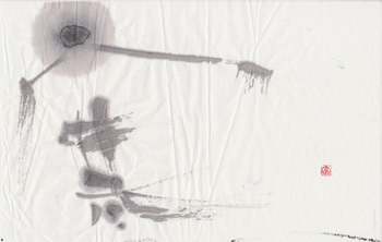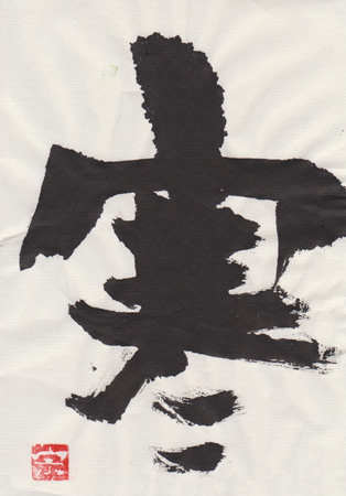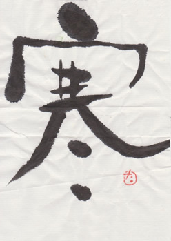 評:「寒」の漢字は、下の二画が氷を表しています。その意味を考えながら作品を見ると、冷たい空気が見えるような作品ですね。淡墨と細い線、にじみを活かして構成されています。白の部分(余白)が多いとさみしい印象にもなるので、とても合っていると思います。