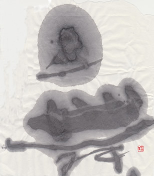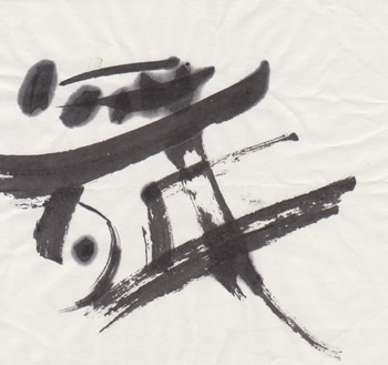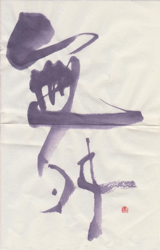 評:色の墨を使い、軽やかな線の作品ですね。線もやわらかく動きの大きいところが、踊っている人のようです。字の左右のバランス(重心)を変えるとそれがよく表現されます。小作品などでは、字の意味に合わせて、色を使って書くのも創作意欲がわいてくると思います。
