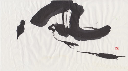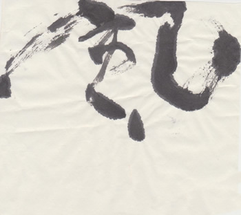 評:この「風」の字は、大きな凧や風船のようで、風を受けて大空へ飛び立とうとしているようなイメージをうけました。大胆に風がまえの中を開けて。動きがあります。中の虫の字を左右どちらかに寄せて、空間をうまく生かしたりすると、作品が生きてきますね。