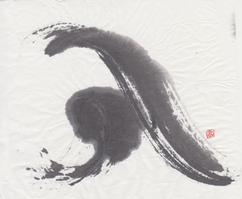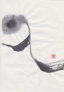 評:今回も面白い作品で、目を引きました。二画目の大胆な太い線が、大きな波のようです。夏の海で、サーフィンをしているような感じで、落款印が人でしょうか?そんな想像をさせてくれるような作品です。このように太細を思いっきりしてみるのもいいですね。