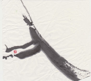 評:「入」の漢字は、二画しかないので、表現が難しかったと思います。こちらは、直線的な線で構成されていて、人が歩いているように見えました。線の割れたかすれなどを活かしていて面白いです。紙の下部に書かれているので、上の余白が広くあるので地を歩いているように見えたのでしょう。