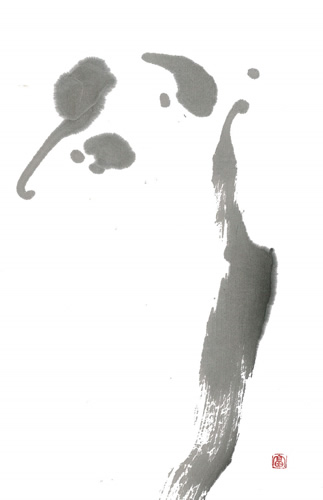 評:こちらも淡墨で、さわやかさがあります。最終画の長いのは、同じですが筆を開いた線で豊かに見えます。思い切り伸ばしたおかげで、左側の余白が明るさを出してくれています。印の位置を左に変えてみると、また違った印象になりますよ。