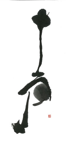 評:二画目が長く高さのある作品ですね。高い建物のように見えてきました。周りの余白が出来て立体感があります。中の縦画を少し淡墨でにじみを効かせて変化を出しています。墨の色が変わり面白い作品になりましたね。