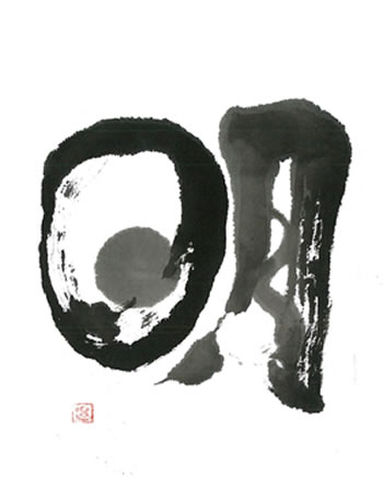 評:とても絵画的で素敵な作品です。月の部分の細線と日の部分の筆が開いた線のコントラストが絶妙です。単純な形なので、変化を思いっきりつけているところが長年の創作に出ていると思います。