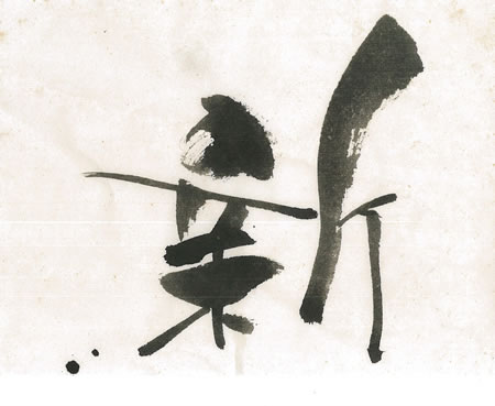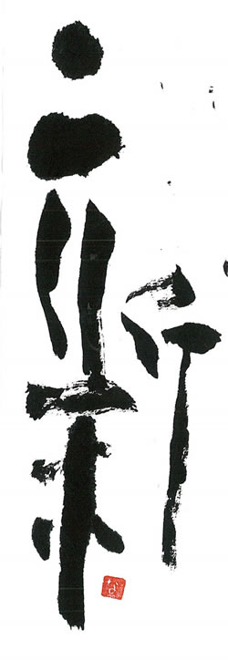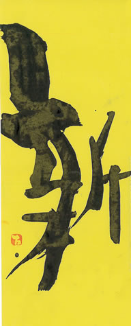 評:黄色の洋紙を使っているので、墨のたまり方が均等でないところが逆に面白さをだしています。紙に墨が食い込まないので、乾くと薄いところと濃いところが出来盛り上がっているように見えます。「立」が背の高い人のようですね!