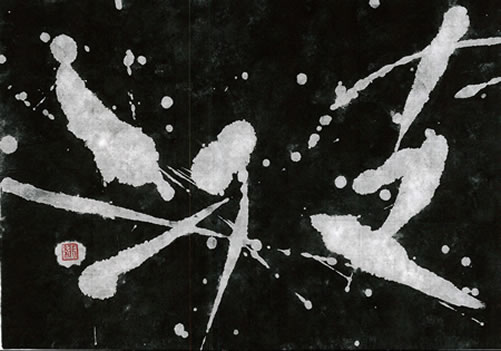 評:こちらは、白抜きになる技法で書かれた作品で、インパクトがありますね。水のしぶきが表現されているようで大きな波が打ち寄せているイメージです。墨で書く感じとまた違うので、仕上がりを想像して制作するのが難しいと思いますが楽しんで書かれているのがわかります。