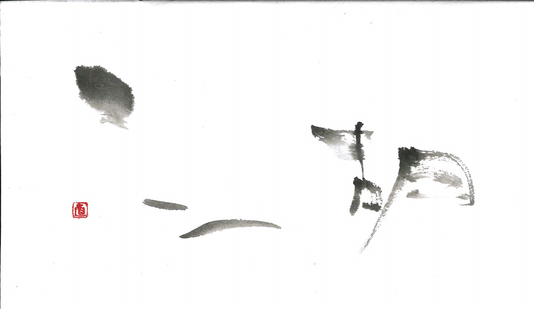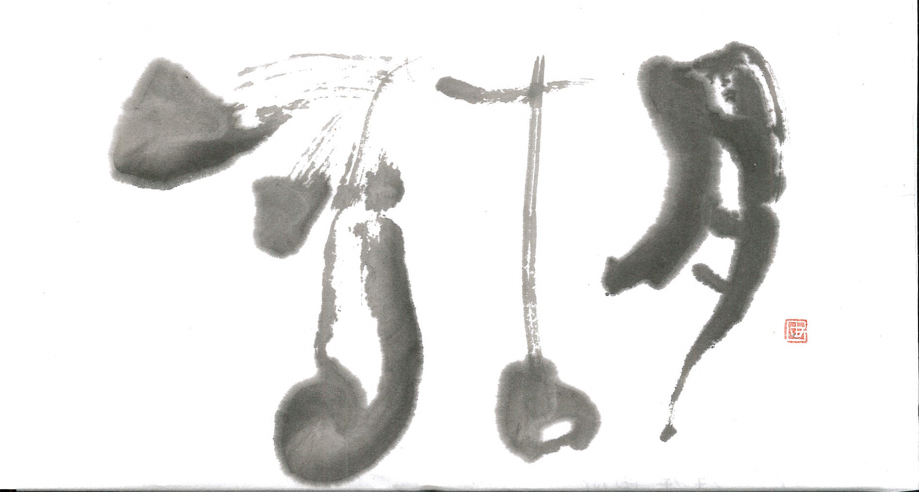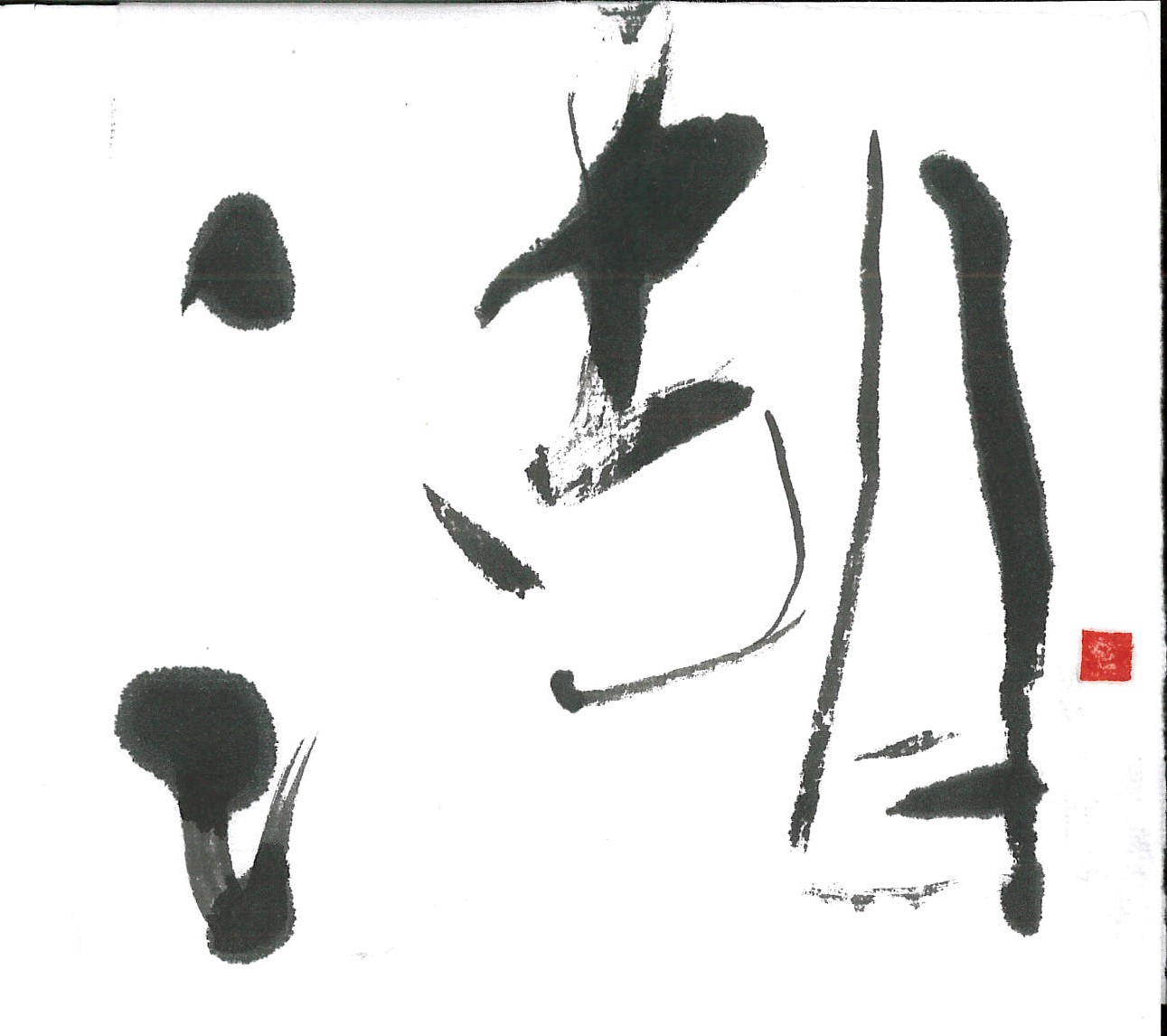 評:こちらは、水墨画の様で情緒ある作品だと思いました。さんずい偏が湖の水面の波のようで、「古・月」が湖のうかぶ舟のような…。にじみにくい紙で墨の濃度でうすいところが出来ていてそれが水墨画の感じを醸し出しているんですね。