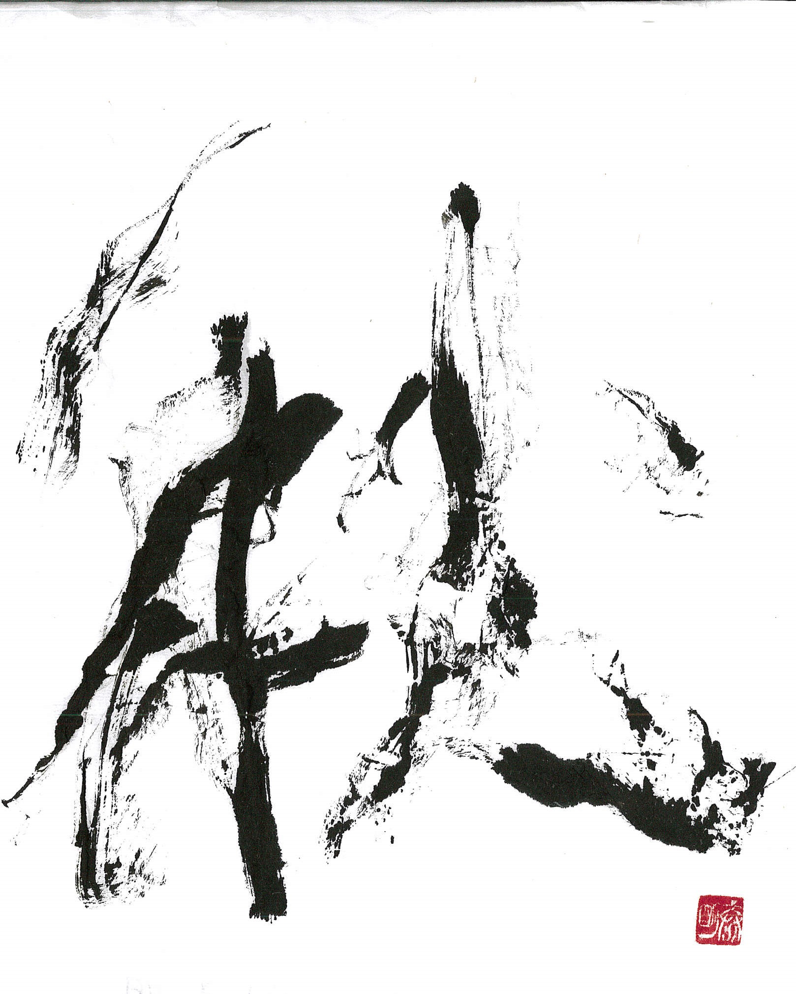 評:ここちらは、しわがれた線なので枯れた草やススキなど…そんなイメージがします。超長鋒を使っているのでしょうか。また沙美をクシャっとして、そのしわをいかしているのでしょうか。面白い作品です。