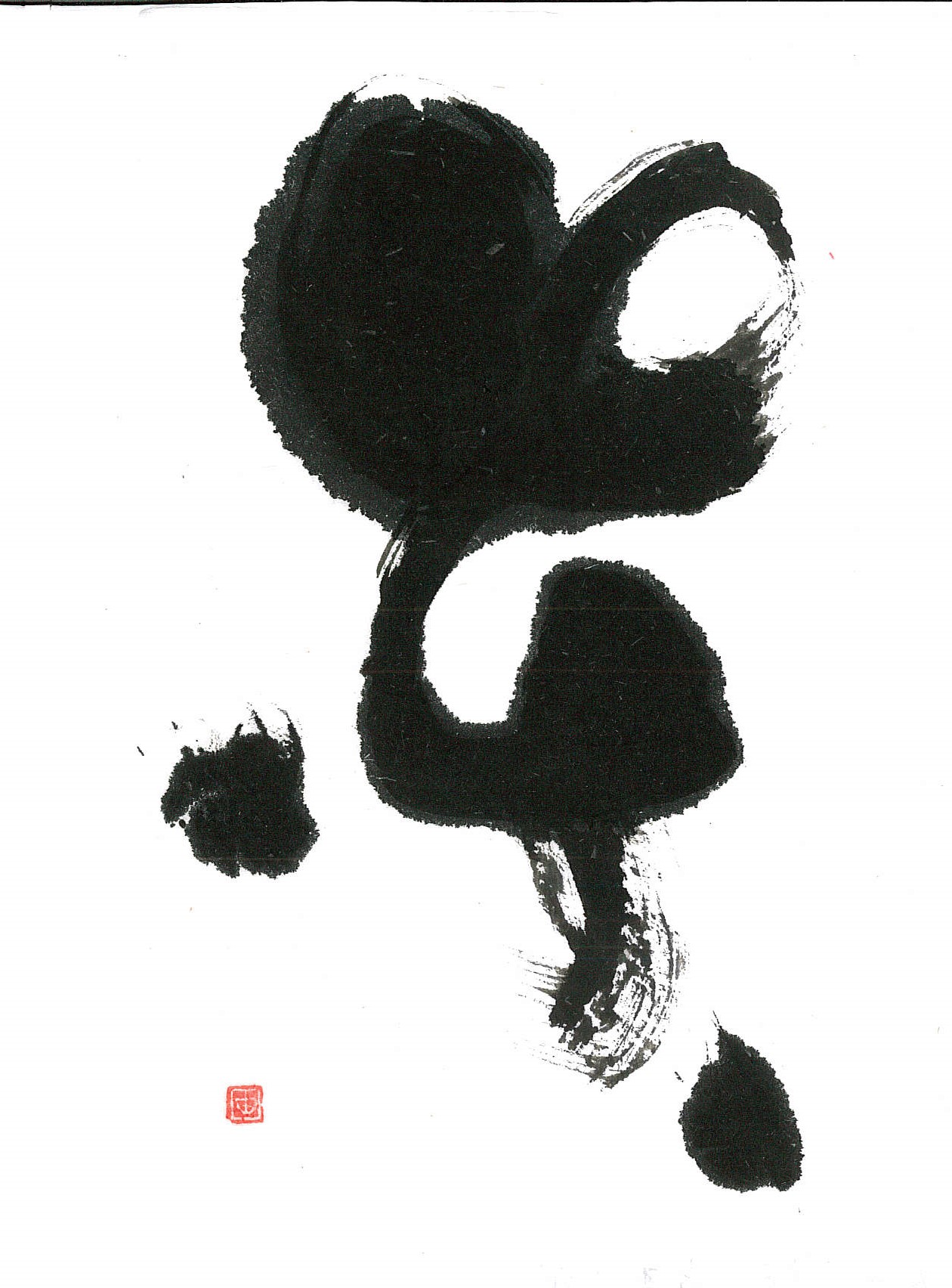 評:紙を仮名の料紙に変えて書かれているので、墨が入らず溜まったところが濃くなりグラデーションになっているのが面白いです。形も丸味を帯びてかわいく愛らしい作品です。