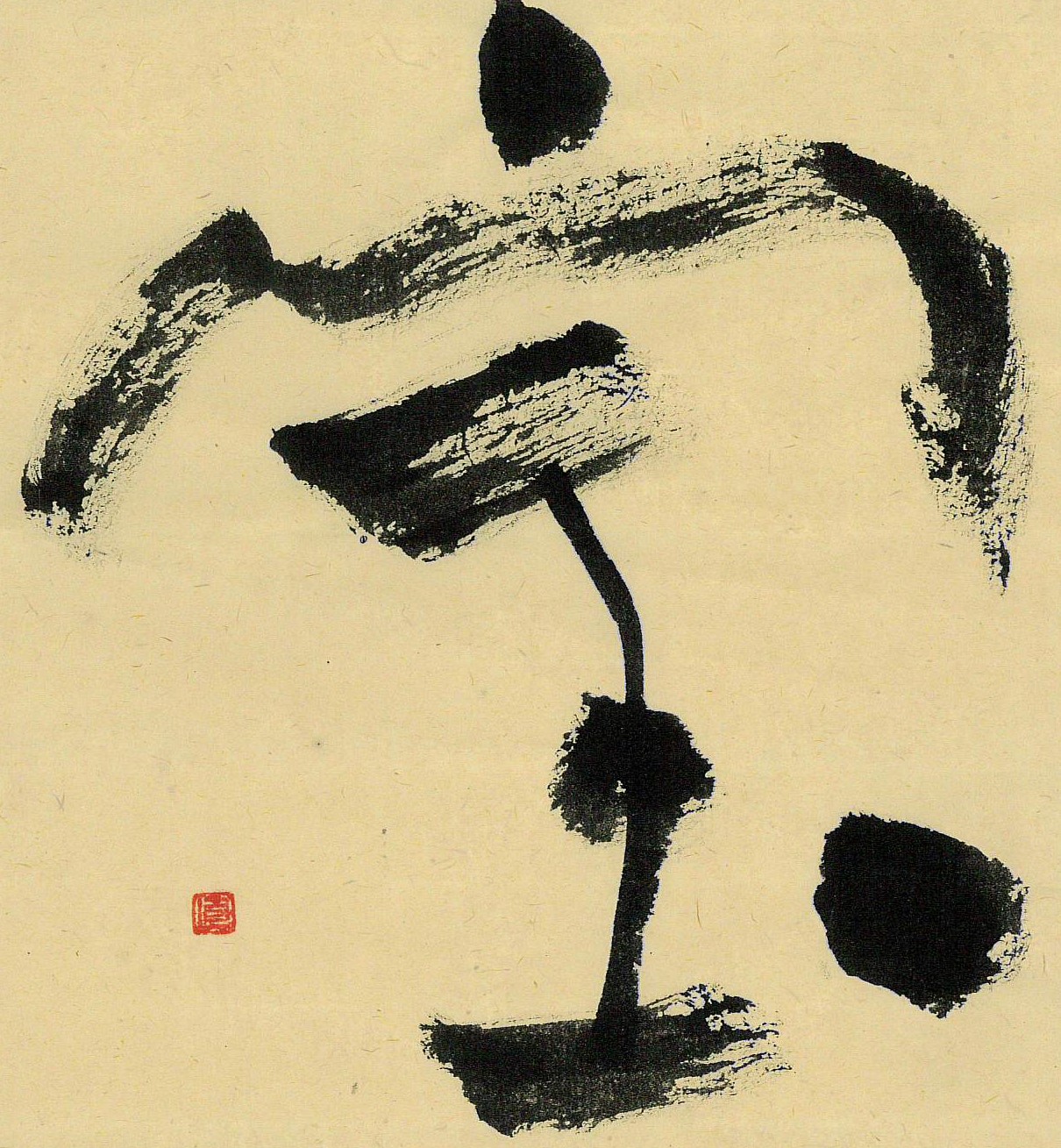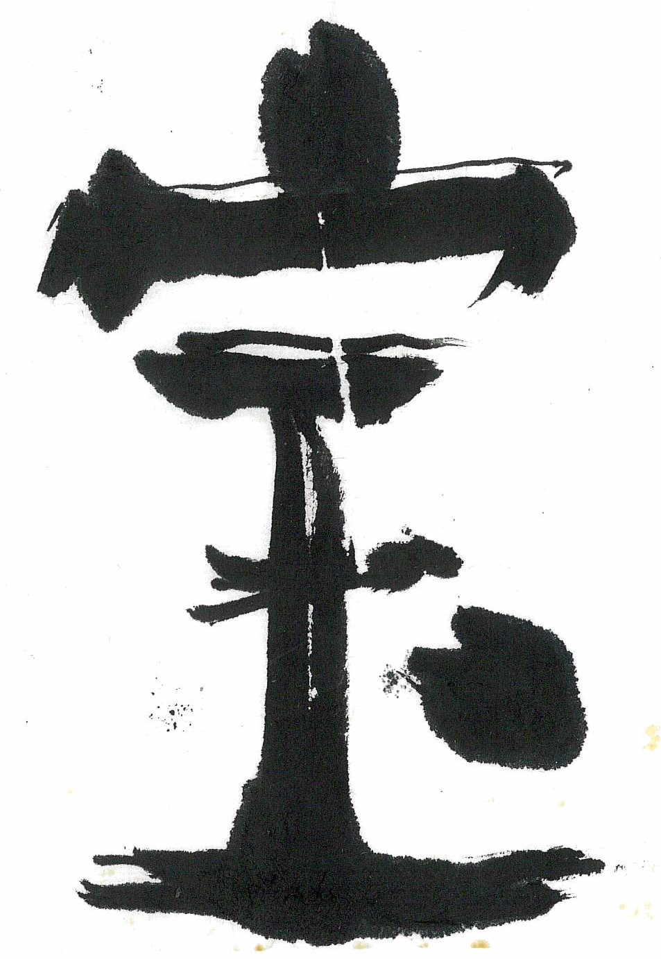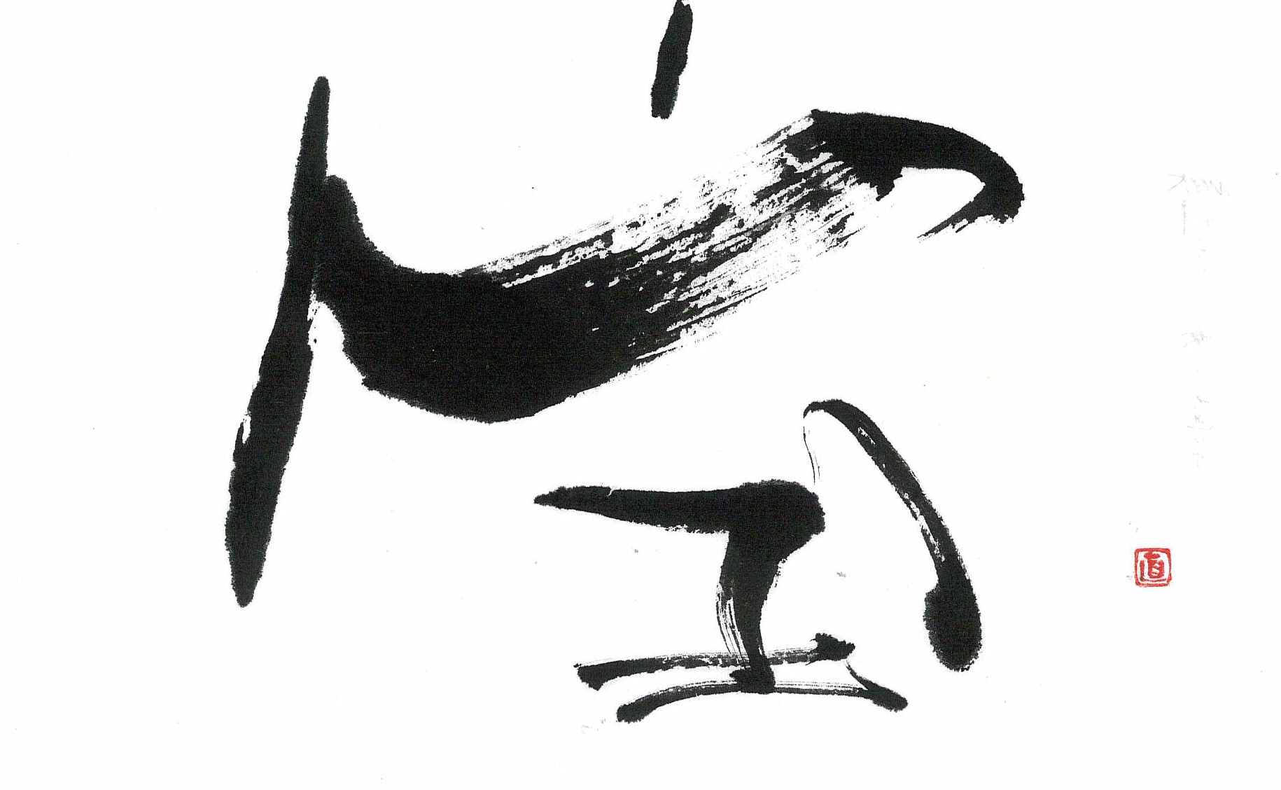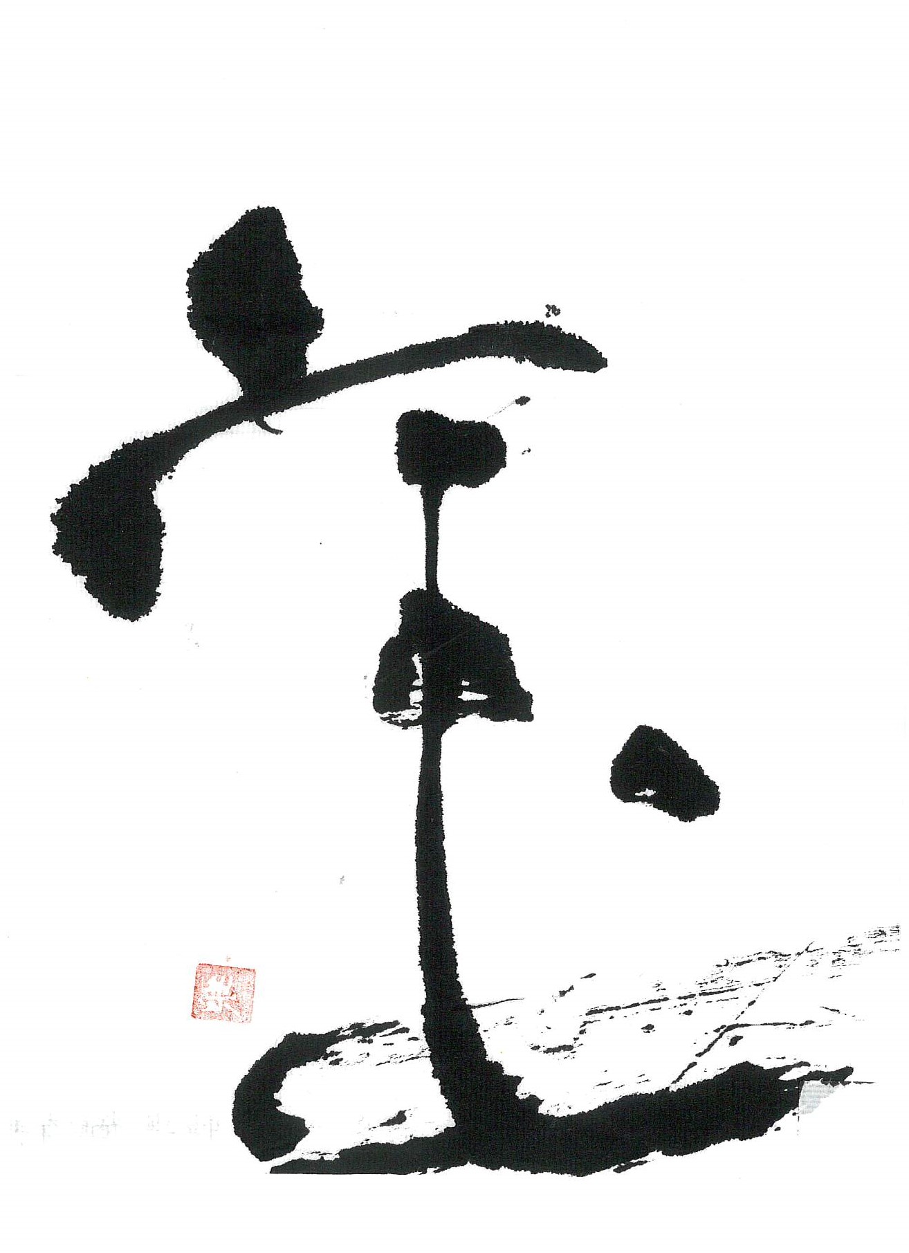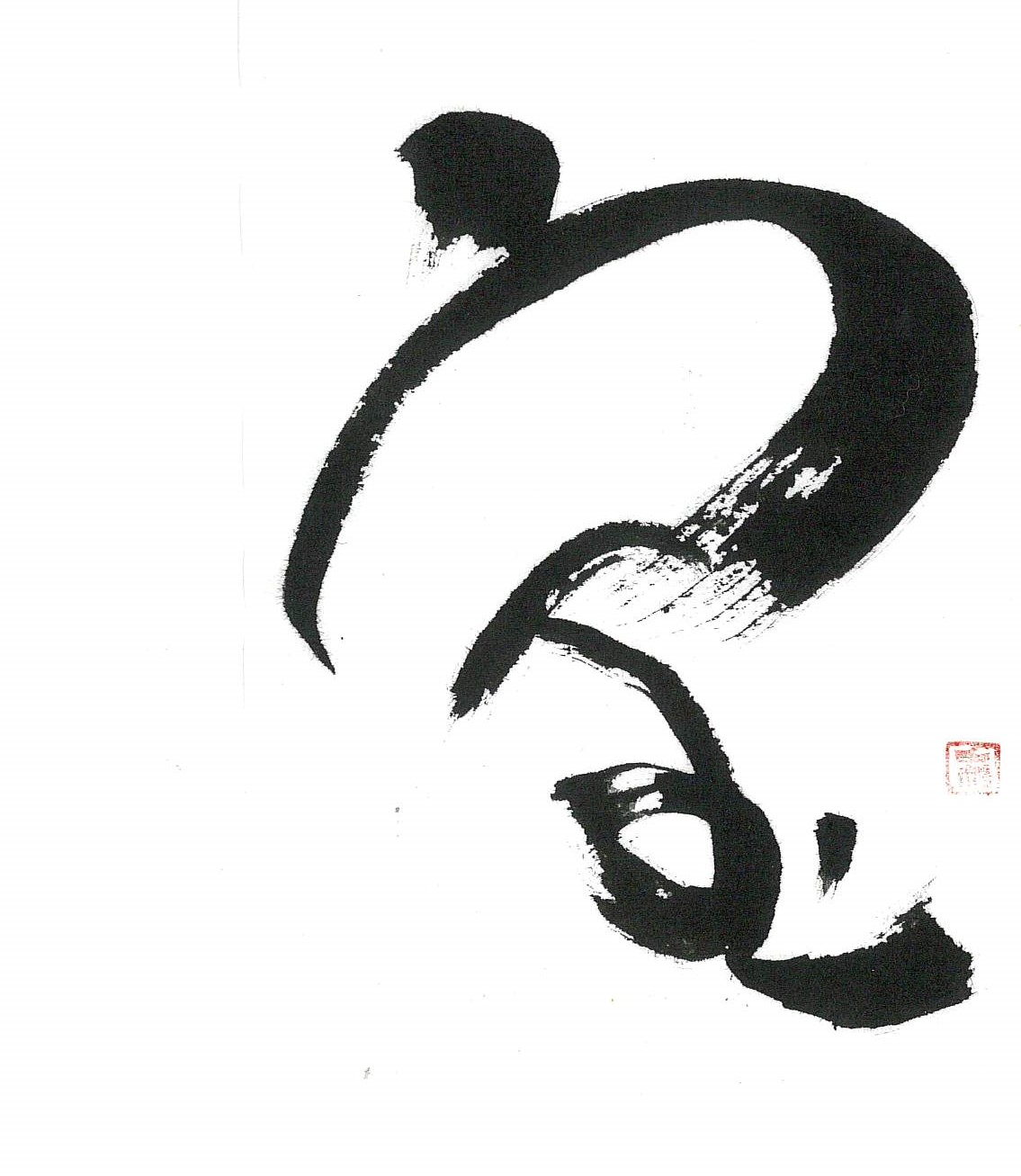 評:宝の中の玉が伸びて面白く、宝物を置く台のように見えました。筆の割れた線を生かして自然に書いているのが良いと思います。左右対称の字ですので、間隔を変えるとまた表情も変わってくると思います。